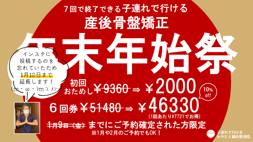 既存患者様のご予約枠確保のため、ご新規患者様が産後骨盤矯正をご予約していただけるのは1月16日(金)以降とさせていただきますm(__)m